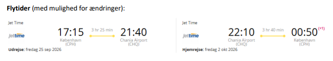 Vi rejser fra Kbh. fredag den 25. september 2026 kl. 17.15 og hjem igen fra Kreta den 2. oktober kl. 22.10. Flyvetid 3 timer og 25 minutter.